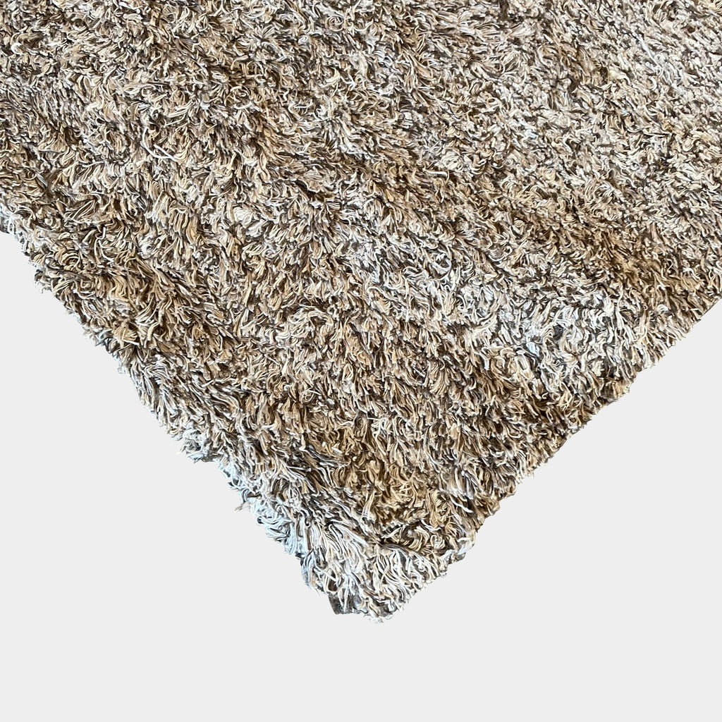 A close-up of the corner of a Kasthall Monroe Speckled Shag Rug on a plain, light-colored floor.