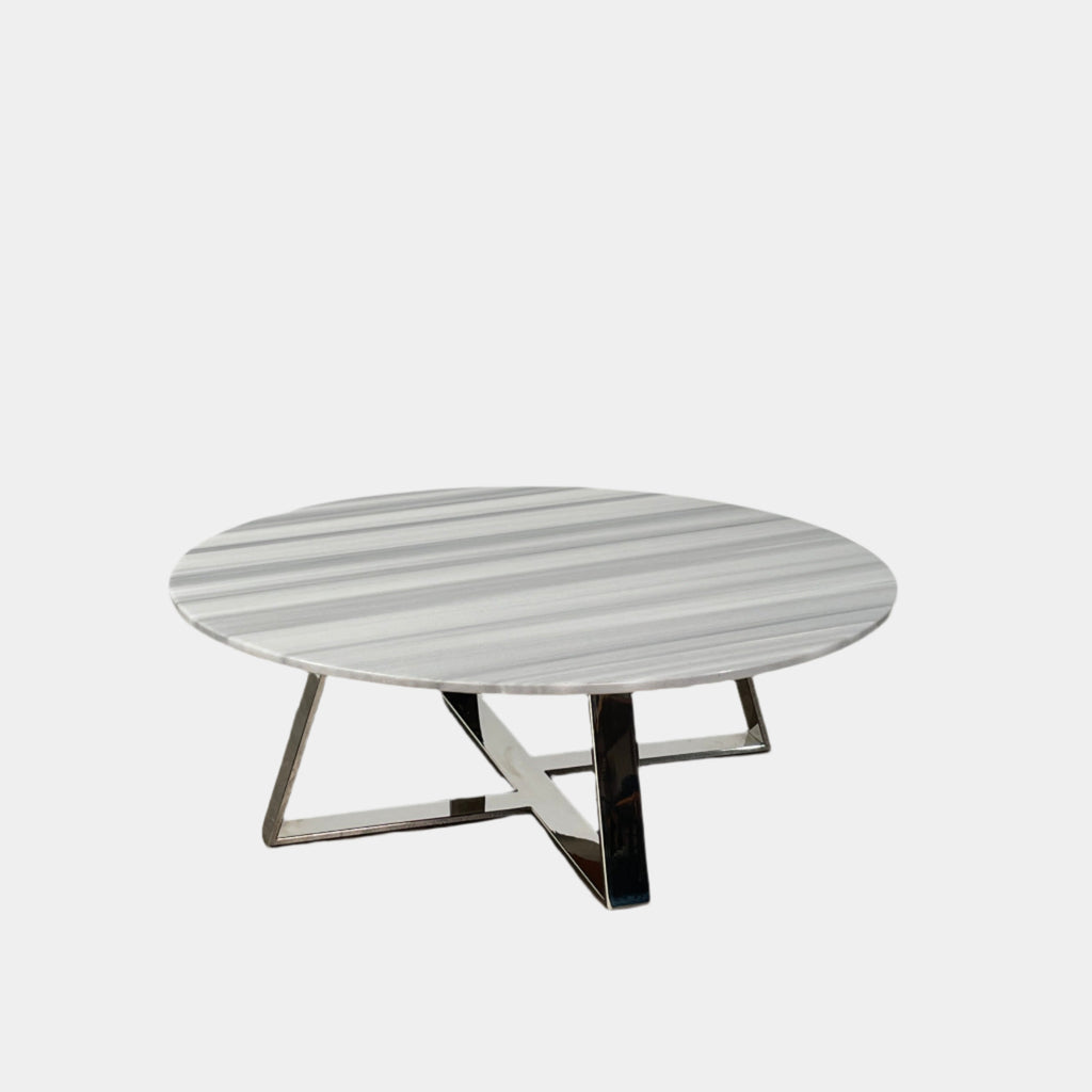 The B&B Italia Mera Accent Table features a round Carrara marble top and a three-legged metal frame with a circular base, showcasing B&B Italia's signature elegance.