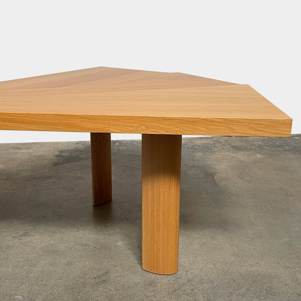 The Cassina Ventaglio Table, a masterpiece of Charlotte Perriand's vision, redefines the essence of versatility in furniture design. Crafted in natural oak, its revolutionary fan shape is not just a style statement but a symbol of functional ingenuity. This table, brought to life by Cassina's skilled carpenters, elegantly comprises fourteen staves, each playing its part in creating a dynamic and innovative piece. Whether gracing a dining room accommodating up to five guests or serving as a spacious desk in a refined office setting, the Ventaglio's asymmetrical design and three-legged base allow for imaginative use and placement. A testament to understated luxury, this table is a striking blend of timeless elegance and contemporary utility, adaptable to both intimate gatherings and professional environments.