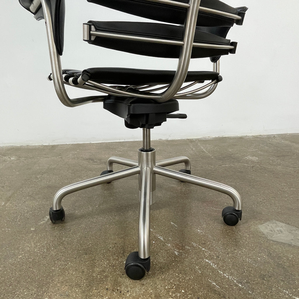 Based on the human spine, De Sede created a unique seat shell made of individually upholstered flexible slats, resembling the structure of ribs. This design extends to the seat, providing both support and relief for the body while seated. Equipped with a headrest, tilt mechanism, height adjustment and casters, this impressive executive work chair provides the highest level of comfort.