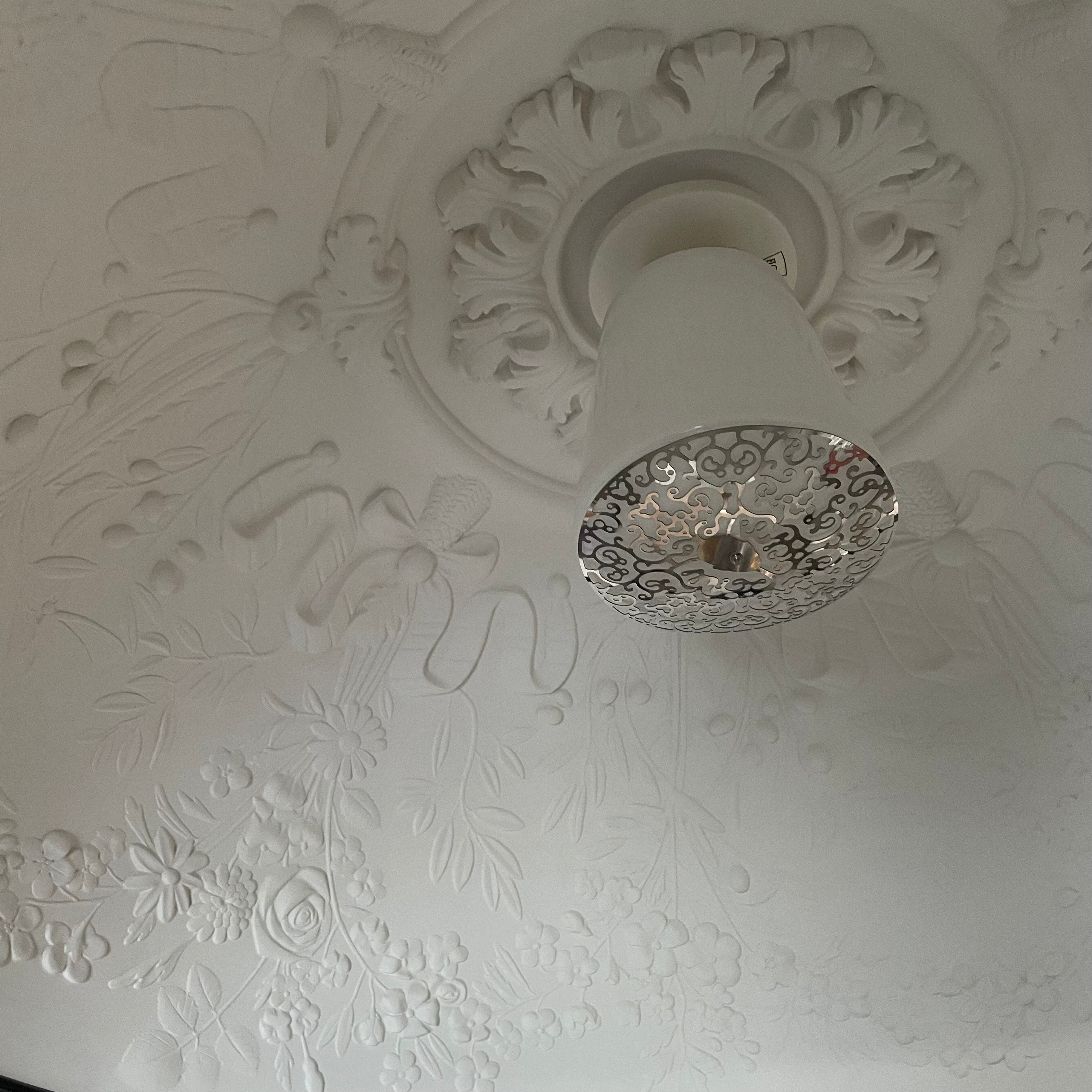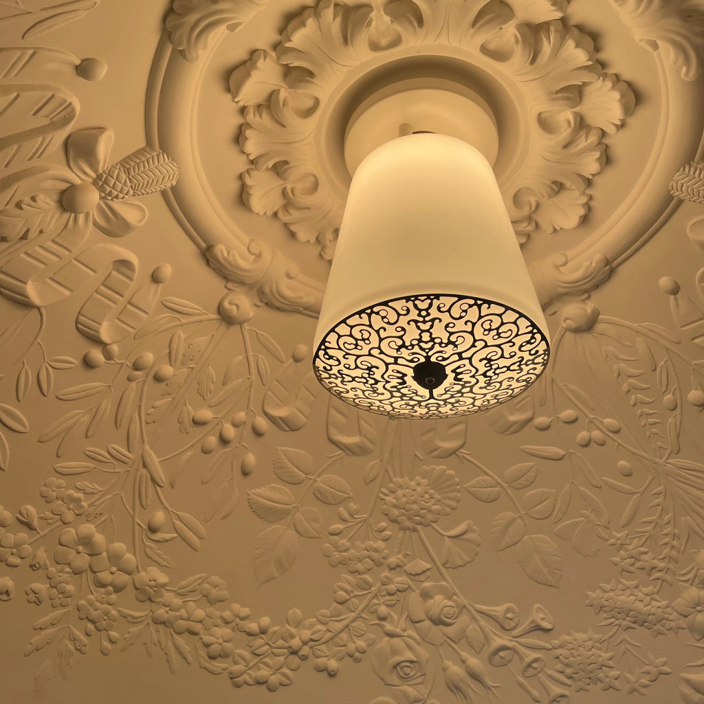 It’s said that beauty comes from within. The ‘Skygarden’ suspension fixture proves the point. A detailed plaster design on the interior shade is the focal point of what is otherwise a sleek, minimal light with glossy white metal diffuser.