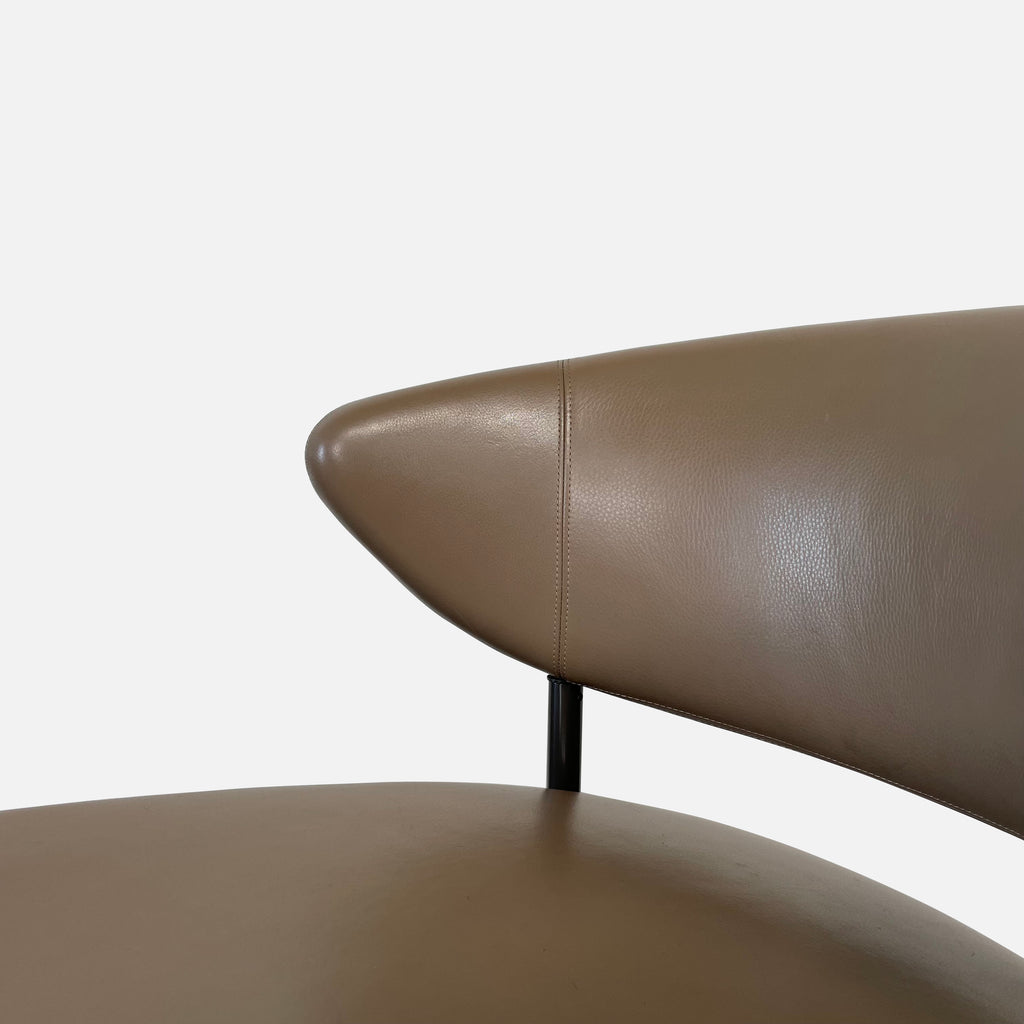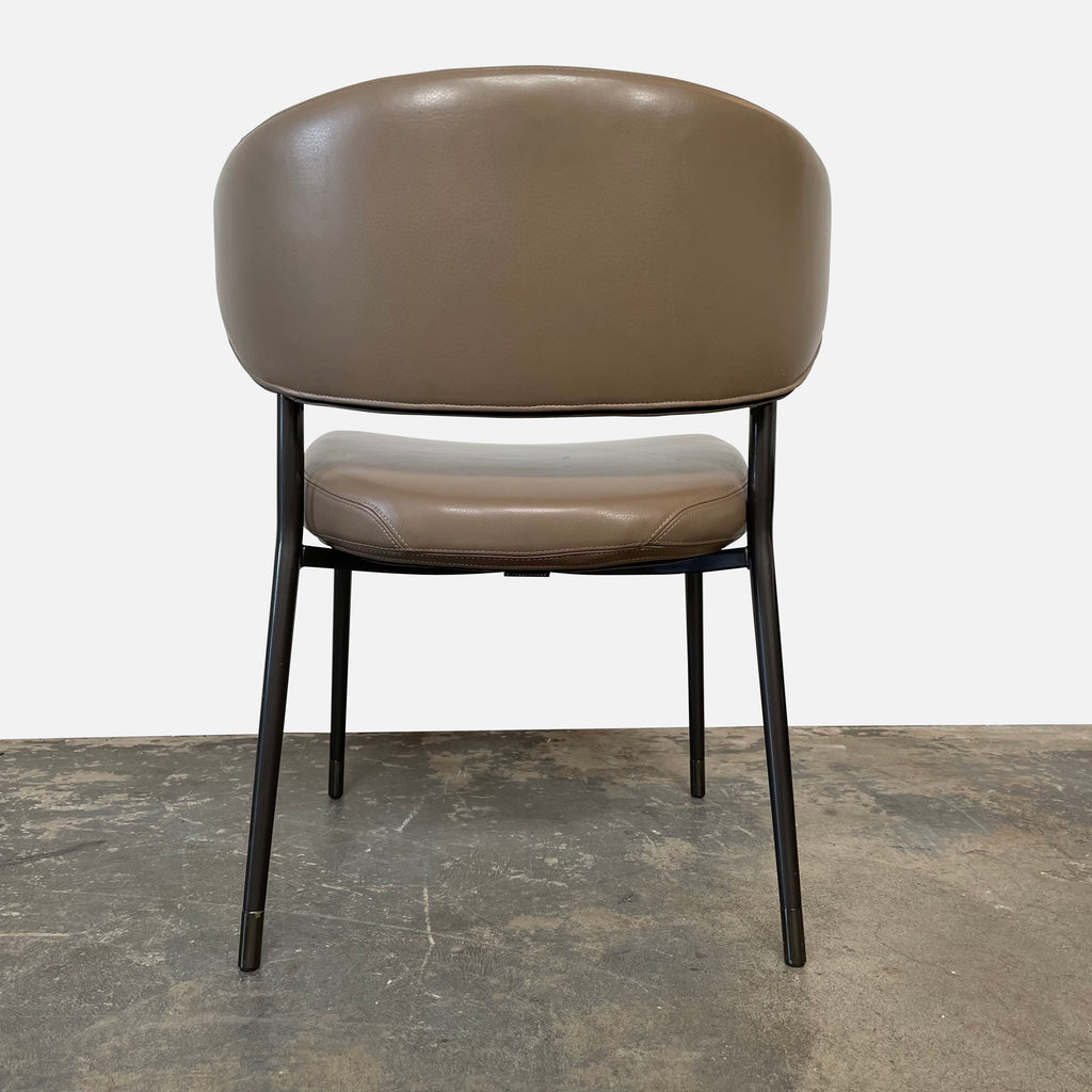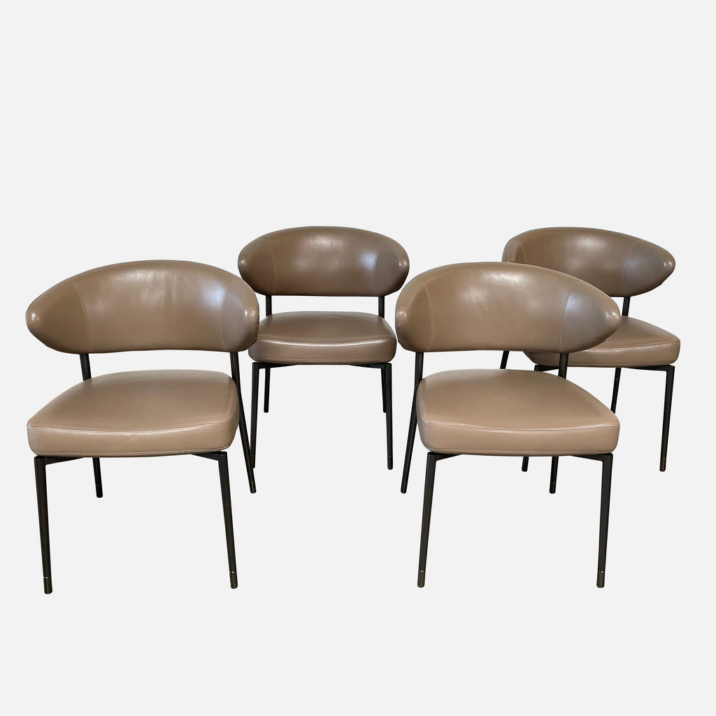 Experience a dining chair that inspires evenings of good conversation! The ‘Mills’ chairs are substantial, comfortable and handsome in medium, warm, taupe leather and glossy pewter finished legs.