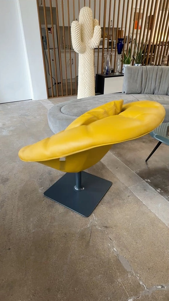 The Moroso Bohemian Low Armchair by Moroso features mustard yellow tufted leather upholstery, a matching cushion, and a black metal pedestal base, shown against a plain white background.