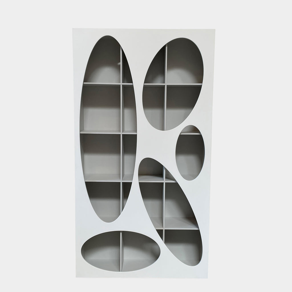 The Roche Bobois Denia Bookcase is a white bookshelf characterized by its abstract design, featuring multiple irregular oval cutouts, nine internal compartments, and integrated LED lighting, reminiscent of ROCHE BOBOIS styling.